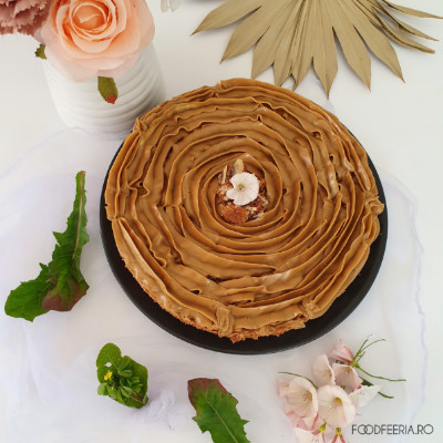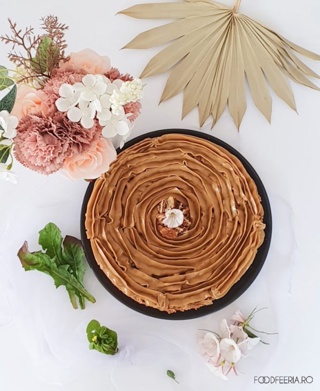 Avem toate gata, deci putem asambla tarta. Punem blatul direct pe platoul cu care vom servi tarat. Fiecare decide cum vrea să procedeze. Puteți pune toata crema peste blat și apoi nucile caramelizate și mărunțite. Sau, puteți proceda ca mine. Am pus un strat de cremă, apoi unul de nuci caramelizate și încă un strat de cremă. Dacă vă pricepeți puțin cu poșul, puteți pune al doilea strat de cremă cu acesta. Astfel aveți direct și un decor frumos.